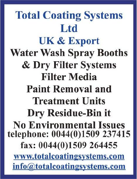 73 twitter: @surfaceworldmag MATERIAL & EQUIPMENT SUPPLIERS NOVEMBER 2022 AIRLESS SPRAY & COATING EQUIPMENT ABRASIVES CLEANING, DEGREASING & PRETREATMENT High Carbon Steel shot and Grit. Low Carbon Steel Shot and metal Bead Stainless Steel Cr and Cr/Ni. No 5, Queensway Link Industrial Estate Stafford Park 17, Telford, Shropshire TF3 3DN Tel: 01952 299777 Fax: 01952 299008 E-mail: sales@pometon.co.uk Eastfield Road, South Killingholme, N.E. Lincolnshire, UK Tel: +44(0)1469 574715 Fax: +44(0)1469 571644 e-mail: sales@scangrit.co.uk www.scangrit.co.uk Scangrit has become one of the leading suppliers of blasting abrasives by meeting the rigorous demands of European Industries. We combine huge resources of skill and expertise to provide you with the widest range of top-performing products, a first-class technical support service and fast reliable deliveries. When you need to take abrasive action, you’ll find Scangrit is a hard act to follow. ABRASIVE BLASTING EQUIPMENT Straaltechniek UK Ltd Unit 8 Valley Works, Grange Lane Sheffield S5 0DQ Tel: 01142 571077 Fax: 01142 571075 www straaltechniek co uk For all your Shotblasting & Engineering needs. ADVICE BOILERS & STEAM GENERATORS 4th & 5th October 2023 To find out more about Surface World please contact Nigel Bean on +44 (0) 1442 826826 or email nigelbean1@aol.com NEC, Birmingham • 100Kg/h – 25,000Kg/h • High efficiency – up to 96% • Low overall emissions • Improved safety • Simplicity of control • Quiet, clean & cool in operation Modern Coil Type Steam Generators & Fire Tube Boilers Tel: 020 8953 7111 info@babcock-wanson.com www.babcock-wanson.com ACID PROOF EQUIPMENT telephone: 0044(0)1509 237415 fax: 0044(0)1509 264455 COMPLETE FINISHING PLANT • PLANT CONTROL SYSTEMS • DATA MANAGEMENT SYSTEMS • BARRELS PROGALVANO ROTOR • BARREL AUTO LOADING SYSTEMS • PROGALVANO FILTERS • SEMI/AUTOMATIC FILTER SYSTEMS • CENTRIFUGAL DRYERS (Large Range • AUTOMATIC DRYING SYSTEMS • ROTARY PAINTING/LAQUERING • TOP COATING/SEALING SYSTEMS • VIBRATORY POLISHING EQUIPMENT • LUBRICATION EQUIPMENT • RECTIFIERS Conventional & Pulse • A/HOUR METERS & DOSING PUMPS