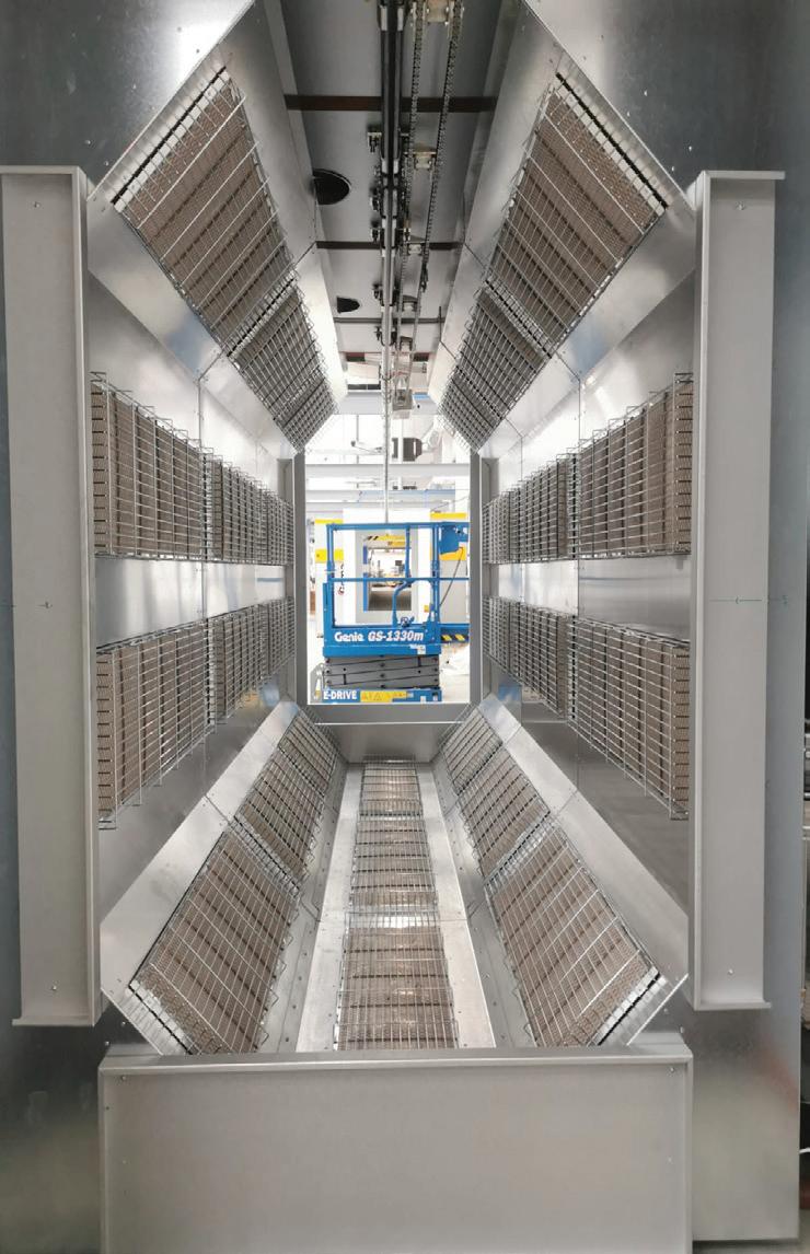 panels to protect their batteries in the event of a side impact while simultaneously preventing overheating in thinner parts of the body shell. This drying method is more environmentally friendly, reducing the required heating process time for the body is by up to 30% compared to conventional systems. An Oxi.X RV from Dürr CTS cleans exhaust air from the oven using the principle of regenerative thermal oxidation (RTO). The oxidation reactions, which purify the process exhaust, occur entirely within the heat exchange media. Since the system operates using electricity, there is no open flame and therefore none of the unwanted by-products of flame combustion.