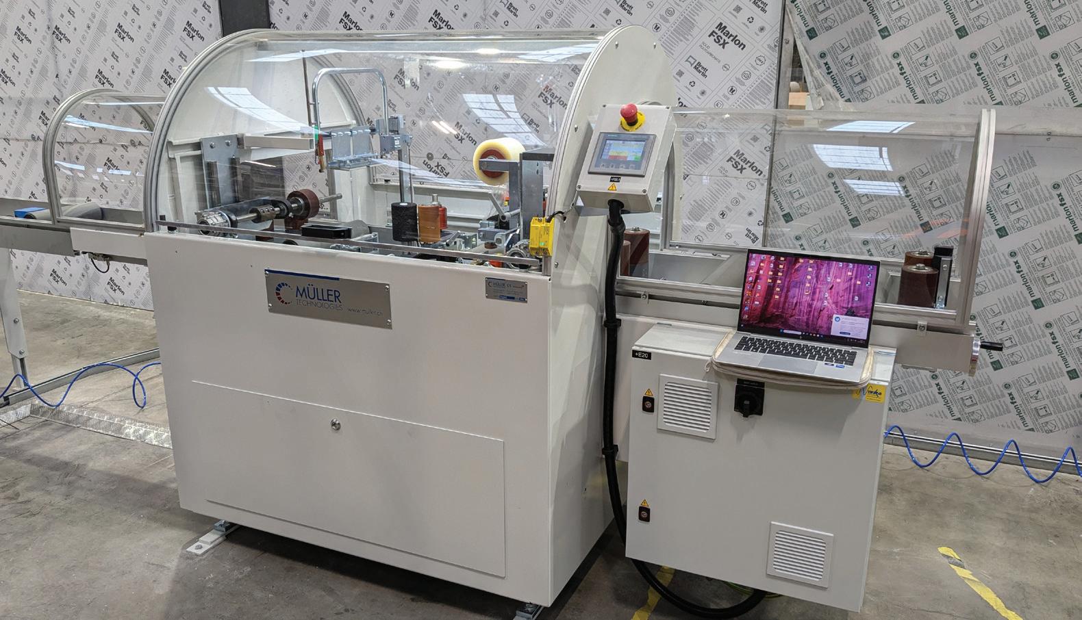 The profile, which is inserted manually or via powered roller conveyors into the filming machine, is conveyed with a drive up to the knurling machine. Usually only one side is foiled in the process, but two-sided foiling is also possible. The beginning of the profile is detected by the control system, the film is pressed on fully automatically and cut off automatically at the end. The machine itself communicates with the downstream machine to synchronise and optimise speeds. This film wrapping can also be supplied for autonomous applications.