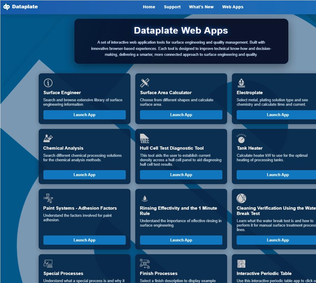 defence surface treatment supply chain. However, Dataplate’s innovation extends far beyond its core software. A standout feature of the Dataplate ecosystem is the growing collection of Dataplate Web Apps—a suite of free, browser-based tools available directly from www. dataplate.co.uk. These interactive applications bring practical, technical knowledge to engineers and quality professionals, helping them make informed decisions on the shop floor and in the lab.