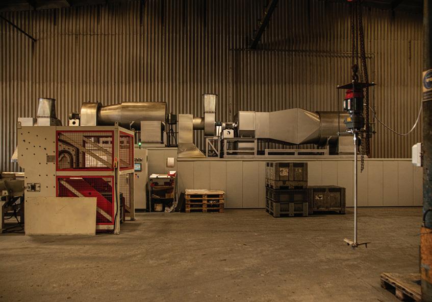 • In-line gas oven 900 x 3000 x 1900 mm deep powered by a Lanemark model FD5CN-30 60kw gas heater with fume extraction with pneumatically opened lid.