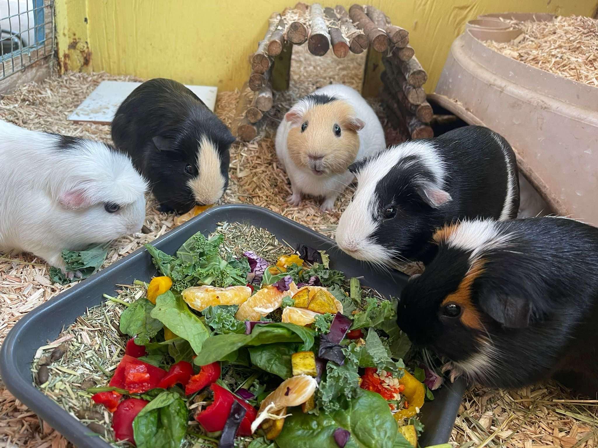 The Guinea Pigs having their afternoon tea - peppers and oranges for vitamin C (like humans, Guinea Pigs can’t make their own vitamin C so need to supplement it) plus lots of healthy greens.