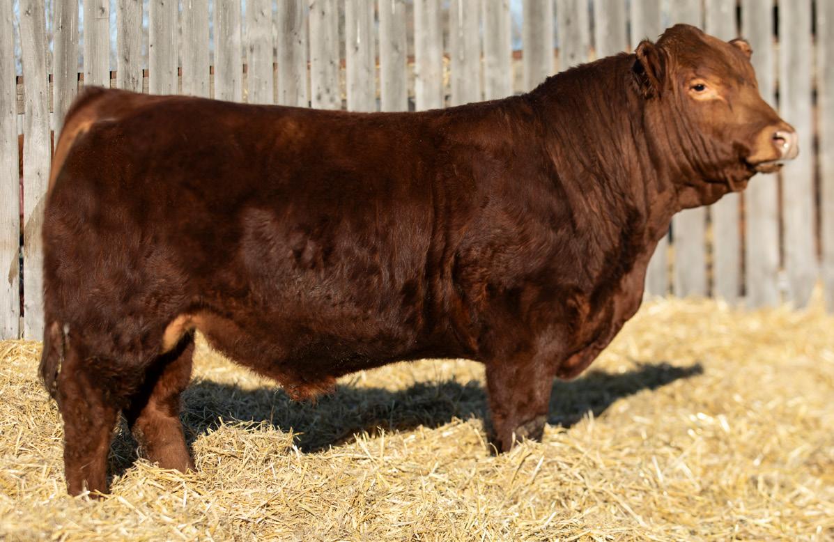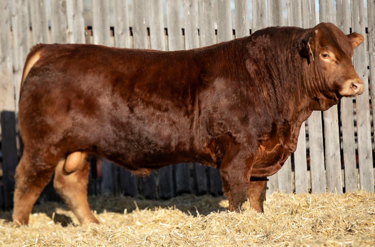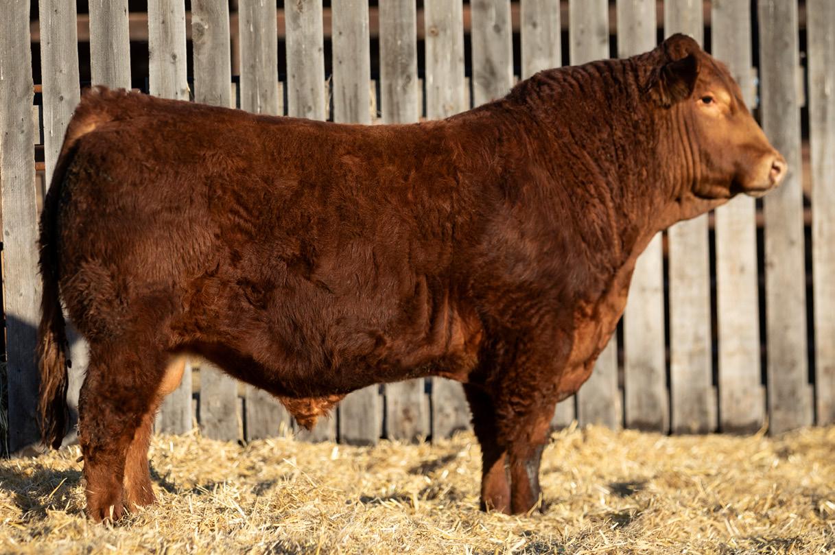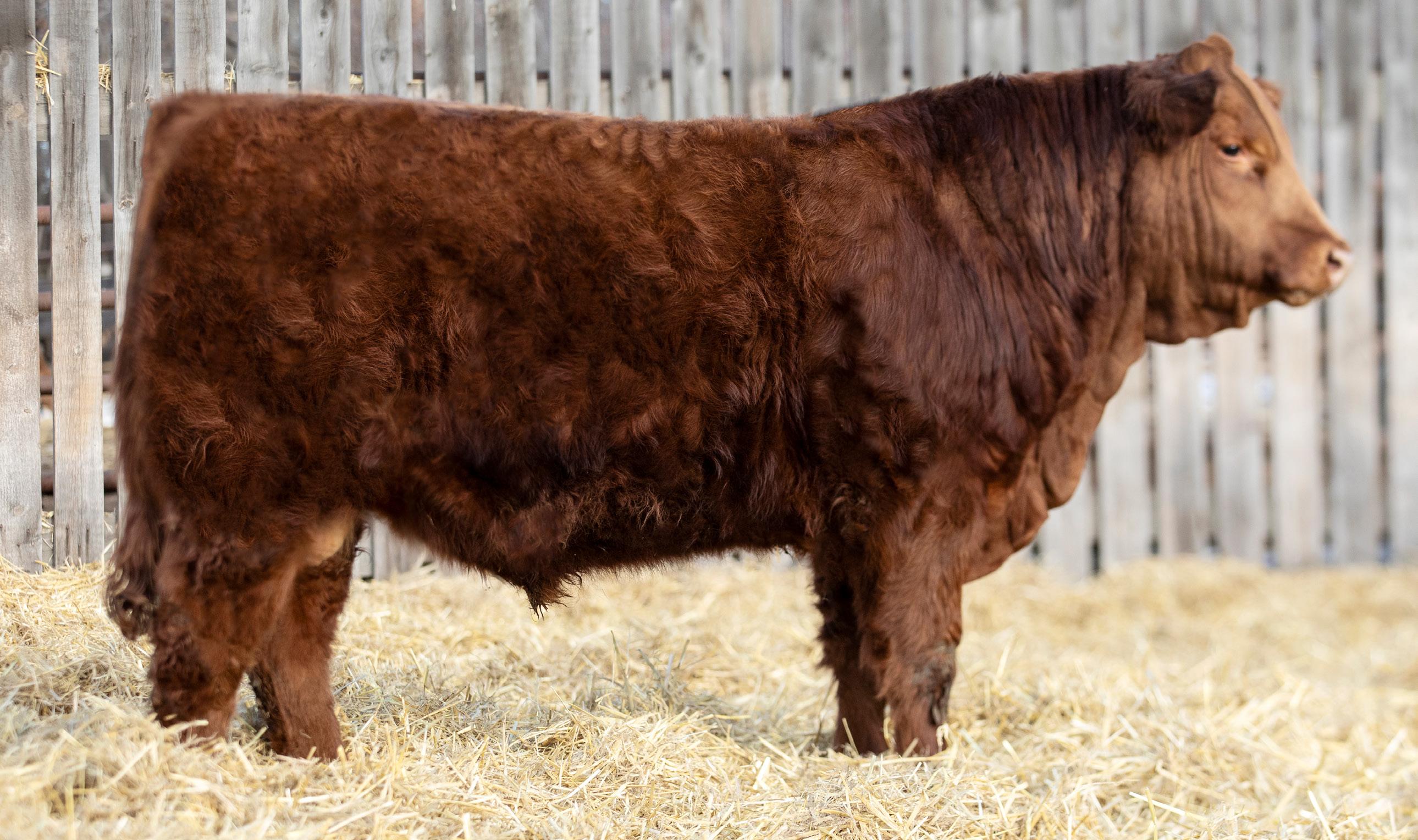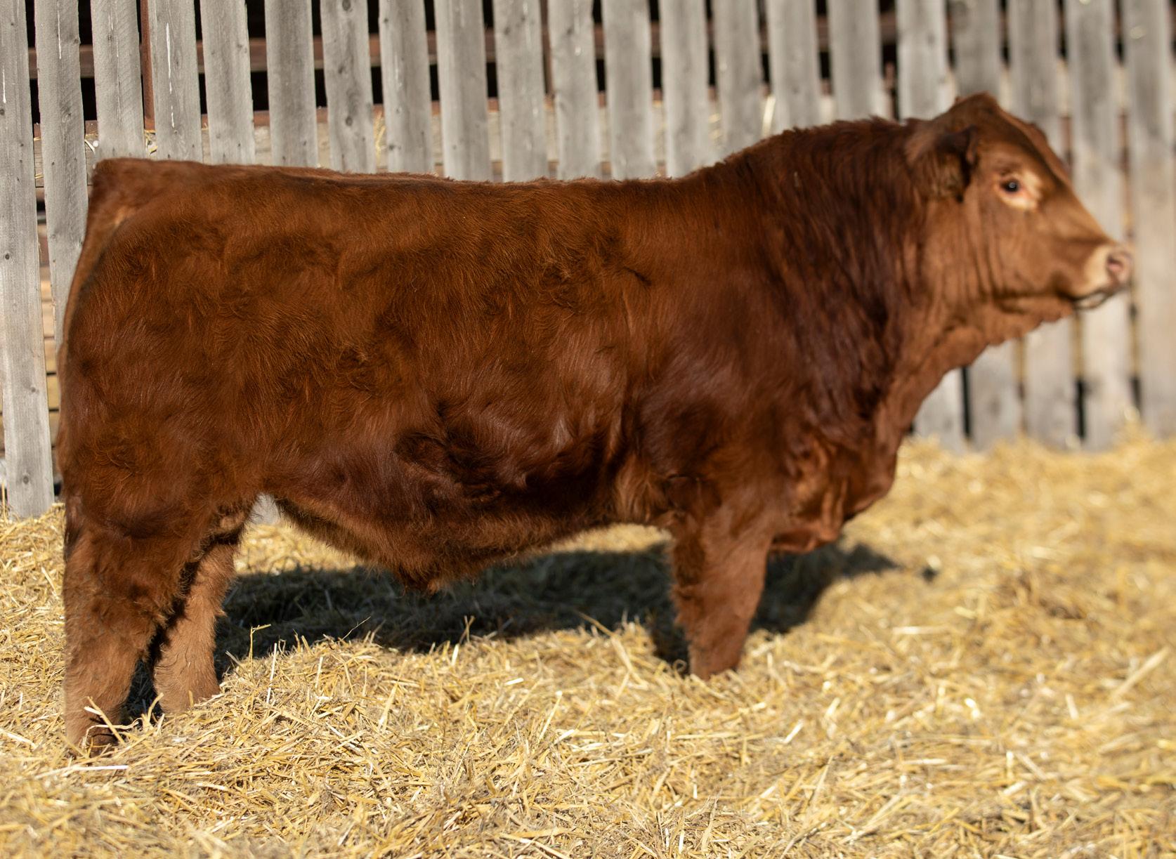 Heifer Bull Option Extremely impressive. Extra thickness throughout, deep bodied and big topped in a clean, correct and balanced package. Good attitude and comes out of a highly productive 10 year old cow with 3 daughters in our herd. Will give you calves you are proud of. Maternal brother sold to Morsan Farms Ltd. Maternal brother sells as Lot 36