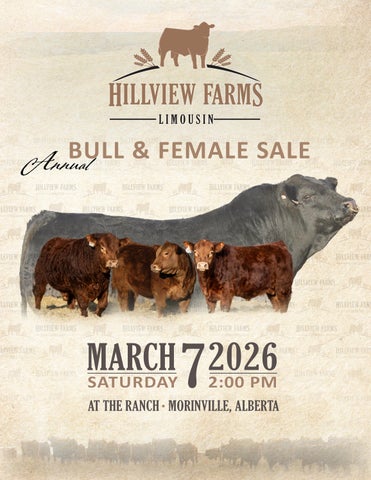 DELIVERY & BOARDING $100 off your purchase if taken home sale day. Free delivery to central regions in Western Canada, at the convenience of Hillview Farms, and buyers risk. Hillview Farms will arrange for trucking at buyer’s cost for purchases going to Eastern Canada or other areas. Purchases can be kept until April 1, 2026, at no charge, after that time, cattle will be kept for $4/day. Please insure purchase(s) left at Hillview Farms.