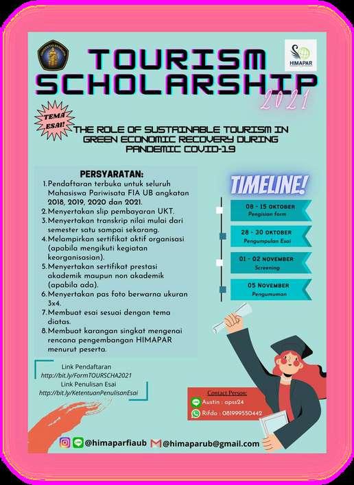 S1 Pariwisata Fakultas Ilmu Administrasi Universitas Brawijaya untuk mendapatkan beasiswa TOURSCHA merupakan suatu program kerja baru yang diselenggrakan oleh Himpunan Mahasiswa Pariwisata (HIMAPAR) penyaluran kepada