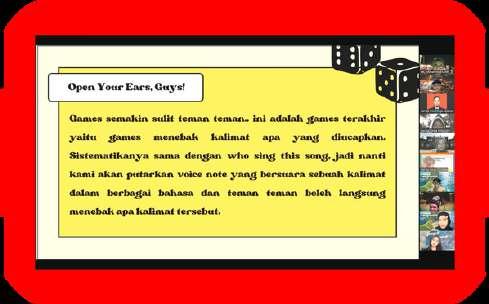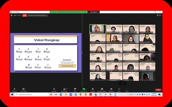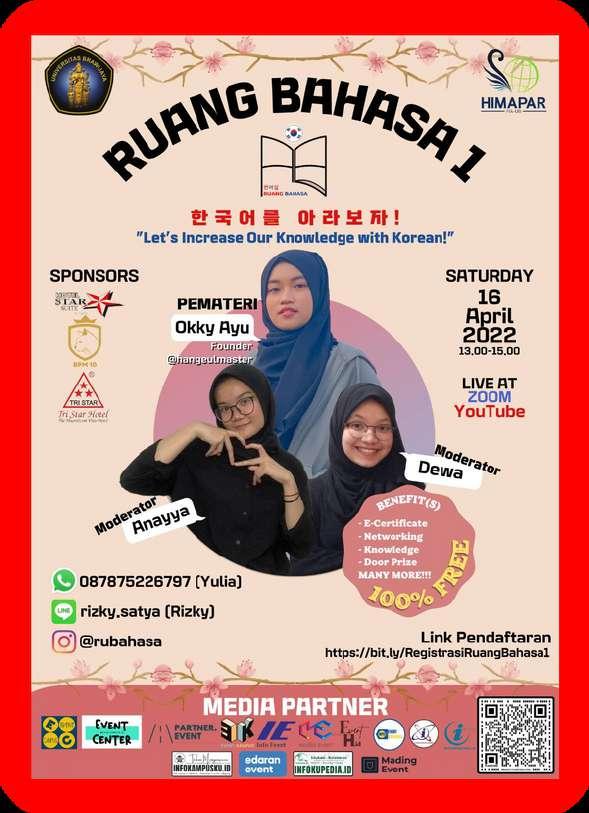 Hi! Magazine Sanskrit Vol 3 17 I HRD Development Apasih Tujuannya? Dengan adanya Ruang Bahasa 1 ini, kami dari divisi development berharap mahasiswa dapat mengembangkan softskill mereka dan juga dapat mengaplikasikan ilmu yang didapat dalam karir di masa yang akan datang. Kami juga mengucapkan terimakasih yang sebesar besarnya untuk para panitia, sponsor yang sudah mendukung Ruang Bahasa 1 sehingga berjalan dengan lancar jaya, yeay!. So, jangan lupa ikuti Ruang Bahasa 2, kami tunggu ya! Kamsahamnida! Selanjutnya juga ada kegiatan utama dari Ruang Bahasa 1 ini yaitu main event yang berupa webinar yang dilakukan secara online melalui Zoom Conference pada Sabtu, 16 April 2022 yang diikuti oleh 200++ partisipan yang sudah sangat antusias dengan Ruang Bahasa 1 ini Di webinar ini, Ruang Bahasa 1 menghadirkan pemateri yang sangat handal yaitu Kak Okky Ayu Permata yang merupakan Content Creator dan juga Founder dari @hangeulmaster. Keren banget ga si pematerinyaaa! Kegiatan RUBAHASA 1