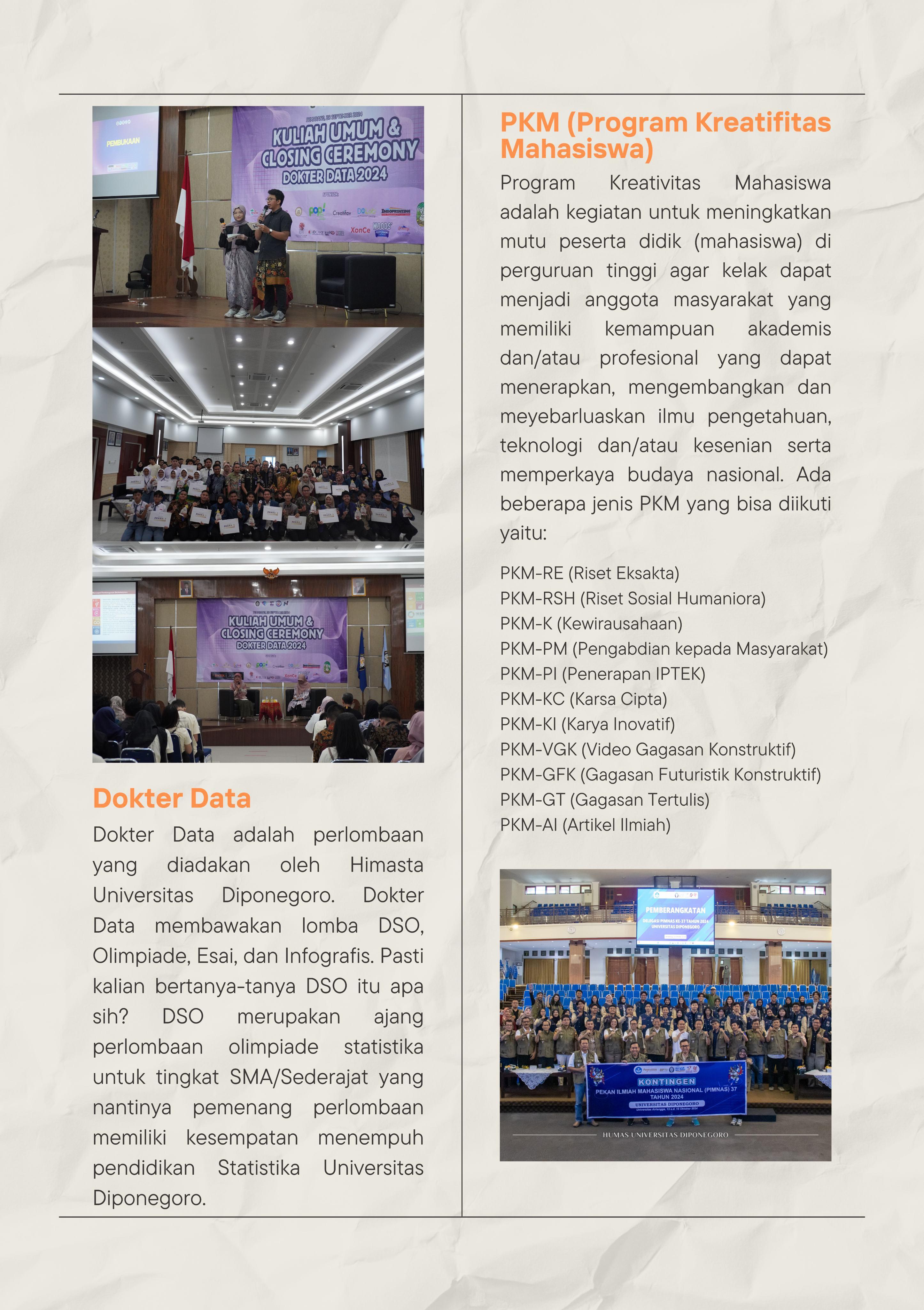 Dokter Data merupakan program kerja tahunan yang telah berjalan sejak tahun 2008. Pada tahun ini Dokter Data merupakan salah satu program kerja unggulan yang dibawakan oleh Himasta. Dokter data terdiri dari 4 cabang perlombaan, yaitu Olimpiade bagi pelajar SMA/SMK/Sederajat dan Olimpiade, Infografis, Esai bagi mahasiswa. Kegiatan Dokter Data mengangkat tema "Dive Into The Future by Leveraging Data Insight to Vitalize the Evolution for Indonesia Emas 2045" yang memiliki filosofi agar para peserta dapat mengeksplorasi dan memahami penggunaan data sebagai alat transformasi untuk dapat mempercepat evolusi menuju masa depan yang diinginkan, yaitu mencapai Indonesia Emas 2045. Babak Final dan Closing Ceremony yang dilaksanakan pada tanggal 28 September 2024 selain merupakan babak final juga terdapat kuliah umum yang dapat diikuti oleh masyarakat umum. Kuliah Umum Dokter Data 2024 bekerja sama dengan Otoritas Jasa Keuangan dengan membawakan tema Talkshow “Empowering the Next Generation: OJK’s Role in Preparing Young People for Indonesia Emas 2045”.