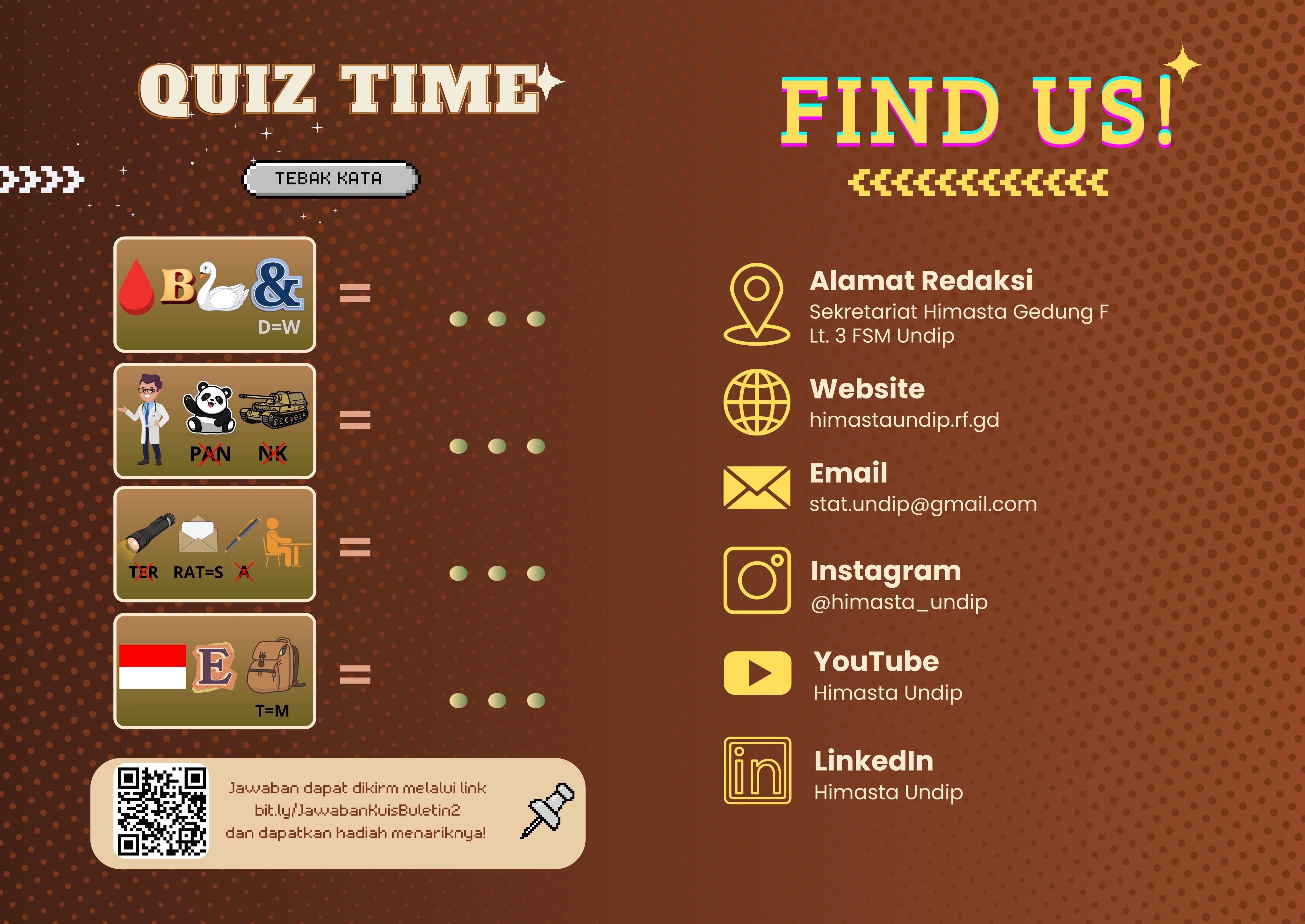 dapat menjadi sumber informasi seputar Statistika Undip dan lingkungan Undip lainnya. Serta dapat menambah wawasan bagi para pembaca dan hendaknya bisa bermanfaat untuk ilmu pengetahuan mengenai statistika. Kami menyadari bahwa dalam pembuatan buletin ini tentunya masih banyak kesalahan dan kekurangan. Oleh karena itu kami dengan senang hati menerima kritik dan saran yang membangun dari pembaca agar buletin ini dapat lebih baik lagi.
