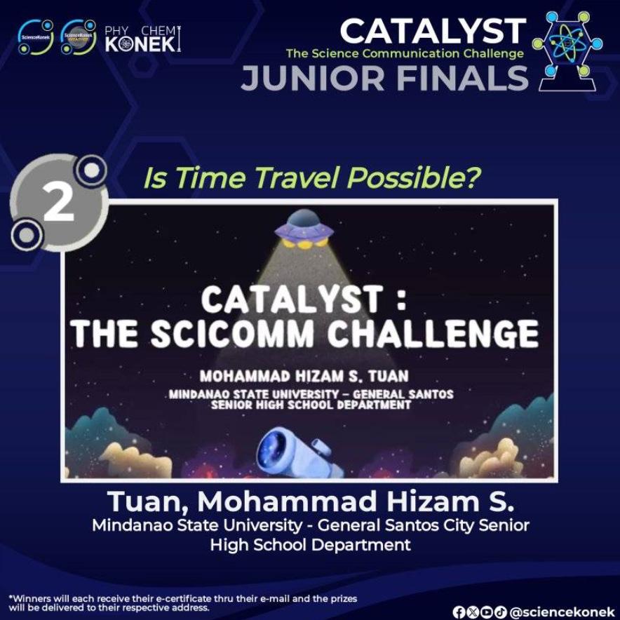 Ang naturang patimpalak ay pinalolooban ng dalawang katergorya, ang Junior at Senior Category. Sa Junior na kategorya ay nakamit ni Mohammed Hizam S. Tuan, isang mag-aaral ng Pamantasang Mindanao ng Senior High School Department ang 1st runner-up sa kanyang konseptong papel na pinamagatang “Is Time Travel Possible?”.