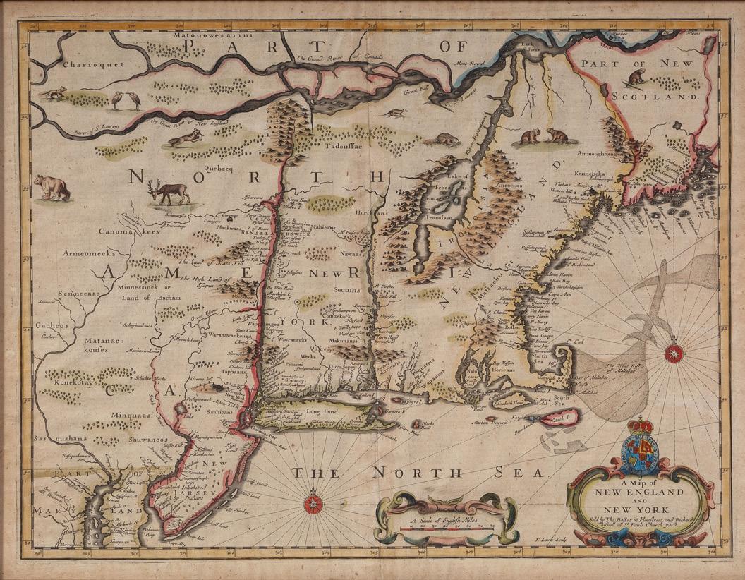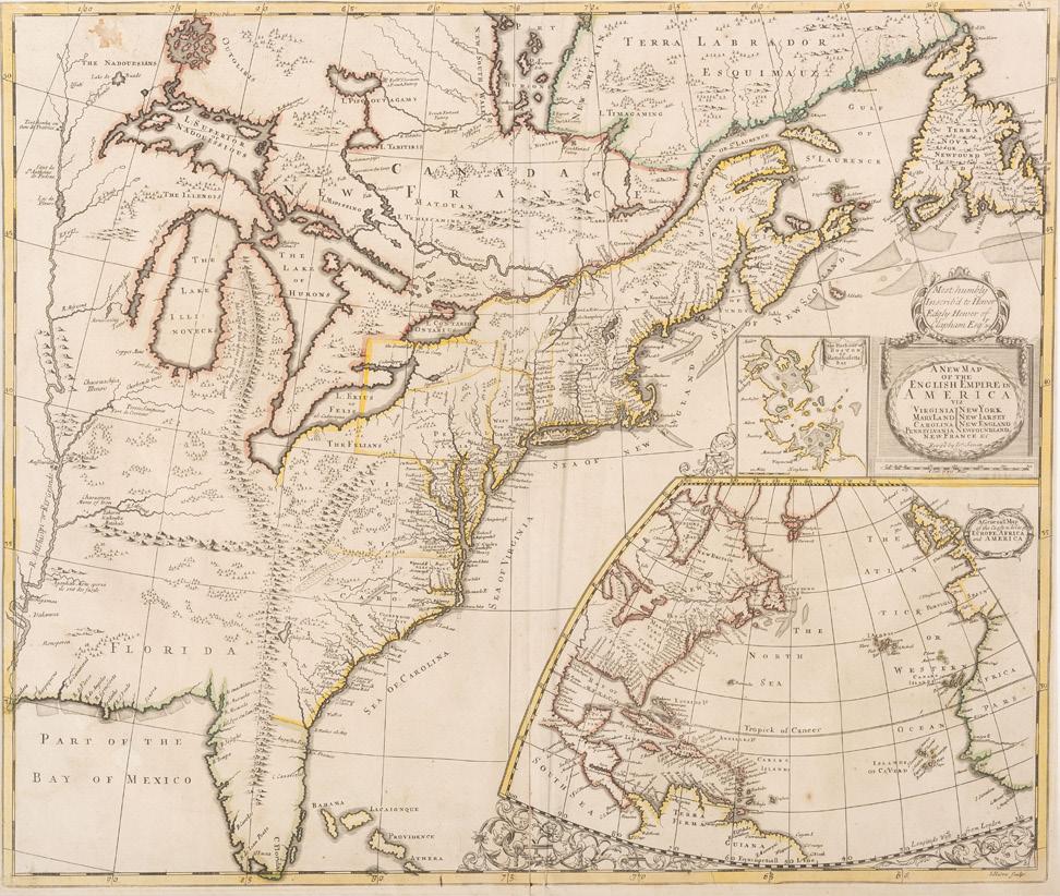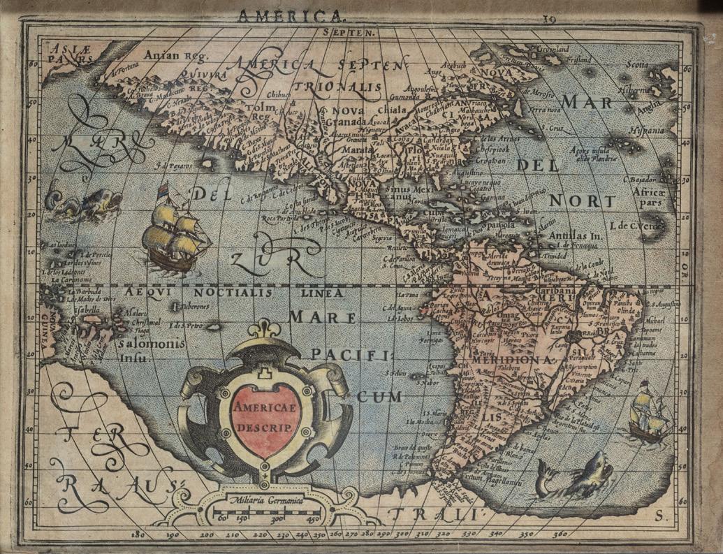 Engraved map of the Americas, 6 3/8 x 8 1/4 inches (162 x 210 mm), matted and framed (unexamined out of frame). Galleons and sea monsters, decorative cartouche.
