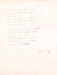 320* GOBINEAU, ARTHUR DE Two manuscript poems signed (“Arthur de G.”), 2pp., s.l., n.d. (“Au printemps autrefois que tout me souvrail . . .”), 12 lines; (“Autrefois, autrefois, j’aimais aussi les fleurs . . .”), 12 lines, in brown ink. 8 1/2 x 11 inches each. Property from the Estate of Antonina Meyer, Chicago, Illinois $600-800