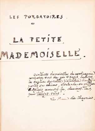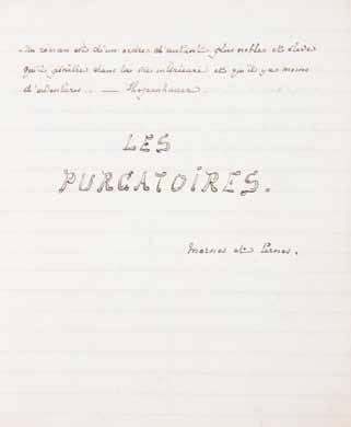 8vo, full soft black-morocco journal, marbled endpapers. 245pp., on both sides, comprising the first draft of Les Purgatoires, different from La Petite Mademoiselle, which, in the previous lot, was also entitled Les Purgatoires. This unpublished manuscript, written in dialogue in two parts, or “Episodes,” entitled “Mademoiselle O. Optat Toccanier” (crossed out) and “Le ‘Hoc Eray in Voyis, de Mademoiselle Archeveque.” Property from the Estate of Antonina Meyer, Chicago, Illinois Provenance: Pierre Beres, Paris, April 5, 1939, ALS $2,000-4,000