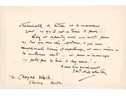 323* WHISTLER, JAMES MCNEILL Autograph note signed (“J. Mc.Neill Whistler”), London, n.d. To Francis Viele Griffin. 14 lines, in French. 4 x 6 inches. Property from the Estate of Antonina Meyer, Chicago, Illinois $300-500