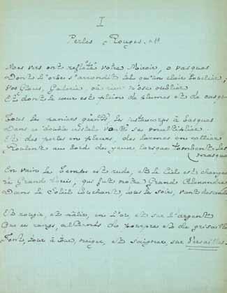 4to, contents loose in decorative boards. Original autographed manuscript draft, 95pp. on varying color paper with revisions in color pencil. One of the few original manuscripts by Montesquiou that were not given to the Musee de Geneve. None have been sold at auction. [Together with:] Les Perles Rouges. 93 Sonnets Historiques. Paris: Eugene Fasquelle, 1899. Folio, publisher’s printed wraps. Edition de luxe, number 80 of 160 copies on velin de cuve. Property from the Estate of Antonina Meyer, Chicago, Illinois Provenance: Bibliotheque de Robert de Montesquiou, April 23, 1923-April 15, 1924, no. 228, vol. 1, p. 87. $1,500-2,500