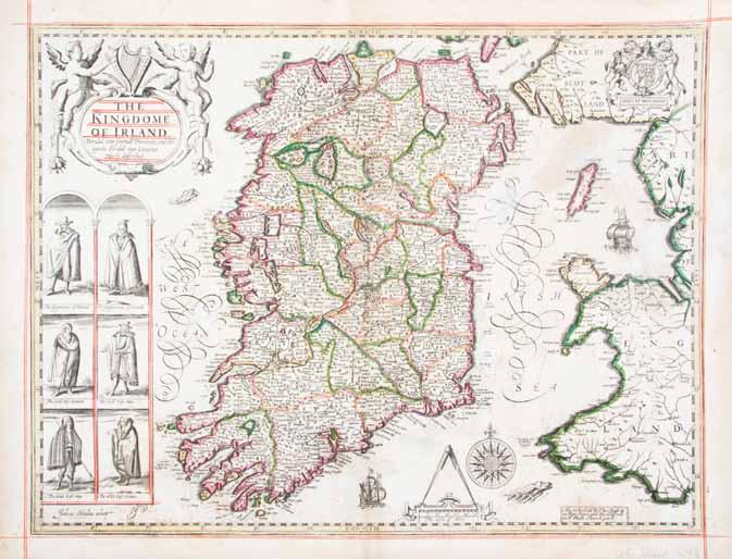 Engraved map showing the west coasts of England and Scotland, decorative title cartouche with two putti, six figures in traditional Irish dress on left, royal coat-of-arms, compass rose, ships, and sea-monsters in the sea. Hand-colored in outline. Text to verso. 22 x 17 1/8 inches. $800-1,200