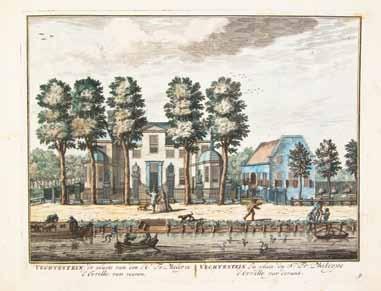 Oblong 4to, quarter calf over marbled boards, gilt-lettered red leather spine label, title page in Dutch and French. Rare second printing of the first edition of one of the finest plate books on eighteenth-century Dutch villas, of great importance to landscape design, with folding map of the River Vecht and 102 half-page engraved plates (24 handcolored) depicting the homes and gardens along the river belonging to the wealthy families of Amsterdam and Utrecht, drawn from nature by Stoopendaal. Plates numbered 1-98, but there are four extra views of the House Driemond as 94ad. Two editions were printed in 1719; the first with 98 plates, the second, and preferred, presented here, with 102, and two statues behind the hedge in plate 94. Lacking frontispiece engraving and all text save the title page, which is present; minor wear to boards, with loss at corners and ends; endpapers creased; repaired tear to fold-out map and title page; minor intermittent spotting. Property from the Collection of David H. Gee, Chicago, Illinois $1,000-2,000