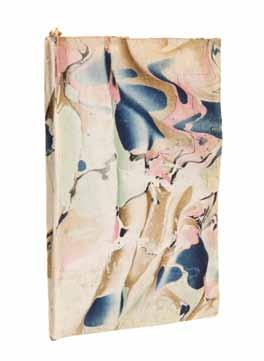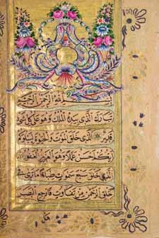 71 (MIDDLE EAST, MSS) QU’RAN An illuminated Qu’ran, 19th-century, ruled in gilt, with some use of red, blue, orange and lavender, three elaborate headings and a few illuminated bars. 8vo, contemporary leather with gilt central medallions, 232ff. Contents starting to detach from backstrip and boards detached; some dampstaining; some text smudged. $400-600 72 (MIDDLE EAST, MSS) QU’RAN An illuminated Qu’ran, 19th-century, richly illuminated with gilt floral borders and elaborate head-pieces and bars incorporating red, pink, green, blue and lavender against gilt pointielle backgrounds, floral text separators throughout. Thin 8vo portfolio, full brown morocco stamped and painted in gilt with borders and floral designs, decorated endpapers, partial, only 27ff. Contents largely detached with chipping to the edges of leaves. $400-600