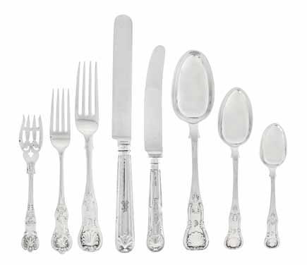 225* An Assembled English Silver Flatware Service, Various Makers, London, Fiddle Thread Shell pattern, most crested, comprising 18 dinner knives, (11) Francis Higgins, 1863, (7) Harry Freeman, 1930 18 dinner forks, (14) Solomon Hougham, 1816, (1) Josiah & George Percy, 1817, (3) William Troby, 1826 17 lunch knives, (11) Eley & Fearn, 1823-24, (6) Harry Freeman, 1930 18 lunch forks, (10) Charles Eley, 1825, (6) William Troby, 1826, (2) maker’s mark rubbed, 1830 18 tablespoons, (1) Paul Storr, 1812, (8) Solomon Hougham, 1816, (2) Hougham, Royes & Dix, 1817, (2) Charles Eley, 1825, (2) William Chawner, 1826, (1) William Eley II, 1826, (1) matching 20th century replacement 18 dessert spoons, (11) Solomon Hougham, 1816, (4) Charles Eley, (1825), (1) matching 20th century replacement 16 teaspoons, (8) Wigham, Royes & Dix, 1817, (8) Robert Whitford, Dublin, 1817 together with 7 butter spreaders, King pattern, Gorham Mfg. Co. 1 basting spoon, King pattern, Gorham Mfg. Co. 1 berry spoon, St. James pattern, Tiffany & Co. 1 serving spoon, Audubon variant pattern 133 pieces, with wood box; 206 ozt 18 dwt excluding knives. Property from the Estate of Mary Griggs Burke, New York City, New York and Cable, Wisconsin $7,000-9,000 226 A Georgian Silver Flatware Service, Most by Richard Pearce, London, 1822-23, the rounded terminals with feathered borders, engraved with beehive and savage head ducally crowned crests and motto NON VU SED ARTE, knives with stag crest, comprising 11 dinner knives, (9) Moses Brent, London, 1807 12 dinner forks, (2) Richard Crossley II, London, 1806 12 dessert forks, (3) Thomas Dicks, London, 1822 12 tablespoons, (1) Samuel Humphreys, London, 1817 12 dessert spoons, (4)William Chawner II, London, 1823 12 teaspooons, (6) William Chawner II, London, 1821, (6) Hyam Hyams, London, 1821 1 sauce ladle, Samuel Humphreys, London, 1815 together with 2 gilt teaspoons, probably Russian 74 pieces; 90 ozt excluding knives. Property from the Collection of a Lady, Oak Brook, Illinois $4,000-6,000 227* A George III/IV Silver Flatware Service, Most by William Eley & William Fern, London, 1806-27, most with rounded down-turned handles, engraved with contemporary demi-lion rampant crest for Stuart, comprising 24 dinner forks 18 lunch knives, some marked for Moses Brent 16 lunch forks 12 butter spreaders, London, 1934, 18 tablespoons 12 dessert spoons 19 teaspoons 12 large teaspoons, London, 1934 6 coffee spoons, Continental, late 18th century 1 salt spoon 1 soup ladle 1 small sauce ladle 1 marrow scoop, Charles & Thomas Wilkes Barker, London, 1804 141 pieces; 175 ozt 14 dwt. Property from the Estate of Gertrude Wells Brennan, Wilson, Wyoming $3,000-5,000