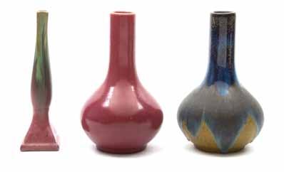 731* Three Van Briggle Pottery Vases, the first of bottle form, the second of tapering ovoid form and the third of ovoid form, each with stylized foliate decoration and a red matte glaze, each with standard marks, two marked Van Briggle Colo Spgs. Height of first 4 1/2 inches. Property from the Collection of Dr. Marilyn Stocker, Chicago, Illinois $100-200 731A A Van Briggle Pottery Vase, of baluster form with floral decoration with Colo Spgs mark. Height 9 1/2 inches. $300-500