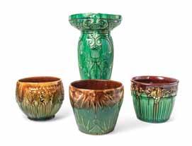 721* Three American Pottery Jardinières, including a Roseville example and two unmarked examples, together with an American pottery pedestal. Height of first 7 1/4 inches. Property from the Estate of Ms. Jacqueline Kuznicki, Chicago, Illinois $150-250 722* Five American Pottery Jardinières, of various forms, sizes and decorations, one marked McCoy. Height 8 1/4 inches. Property from the Estate of Ms. Jacqueline Kuznicki, Chicago, Illinois $200-400