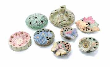 726* A Collection of Eight American Pottery Flower Frogs, of various makers and forms, including examples by Weller and others. Width of widest 6 inches. Property from the Estate of Ms. Jacqueline Kuznicki, Chicago, Illinois $150-250