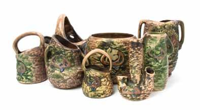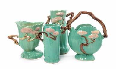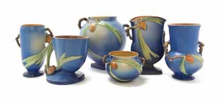 615* Five Roseville Pottery Articles, each in the Pine Cone pattern, comprising two wall pockets and three vases with a brown ground, four numbered 466, 479-7, 704, 838-6, three marked Roseville. Height of tallest 7 1/4 inches. Property from the Estate of Ms. Jacqueline Kuznicki, Chicago, Illinois $300-500 616* Four Roseville Pottery Articles, each in the Pine Cone pattern, comprising a vase, two baskets and a ewer, each with a green or blue ground, three numbered 408, 408-6, 445-9. Height of tallest 9 inches. Property from the Estate of Ms. Jacqueline Kuznicki, Chicago, Illinois $150-250