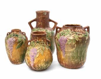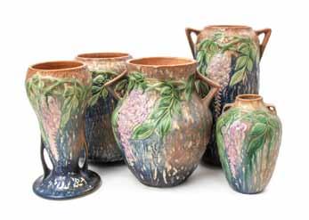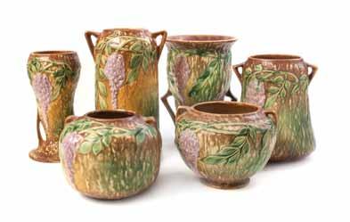 651* Four Roseville Pottery Vases, each in the Wisteria pattern, of handled baluster form with a yellow ground, one with original foil label. Height of tallest 9 inches. Property from the Estate of Ms. Jacqueline Kuznicki, Chicago, Illinois $700-900 652* Six Roseville Pottery Vases, each in the Wisteria pattern, of handled form with a yellow ground, two with original foil label. Height of tallest 10 inches. Property from the Estate of Ms. Jacqueline Kuznicki, Chicago, Illinois $1,000-2,000