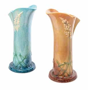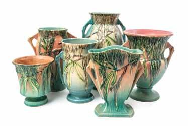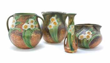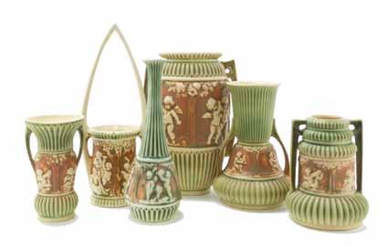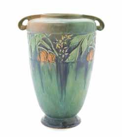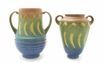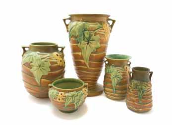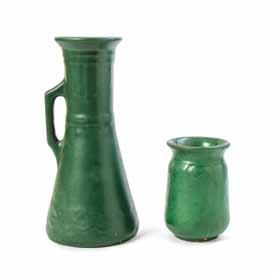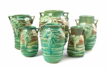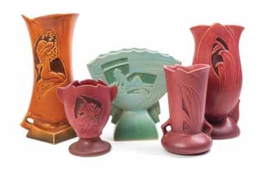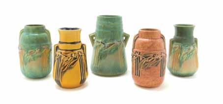 585* Five Roseville Pottery Vases, each in the Jonquil pattern, four of handled form, one of tapering form with a flared rim and one with original foil label. Height of tallest 8 1/4 inches. Property from the Estate of Ms. Jacqueline Kuznicki, Chicago, Illinois $300-500 586* Five Roseville Pottery Vases, each in the Laurel pattern, two of handled ovoid form, two of handled tapering form, three with a green ground, one with a yellow ground and one with an orange ground, three with original foil labels. Height of tallest 7 1/4 inches. Property from the Estate of Ms. Jacqueline Kuznicki, Chicago, Illinois $500-700