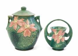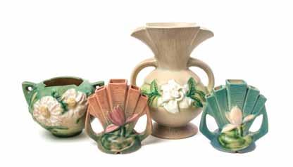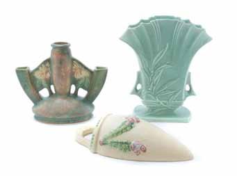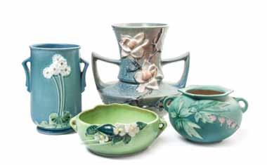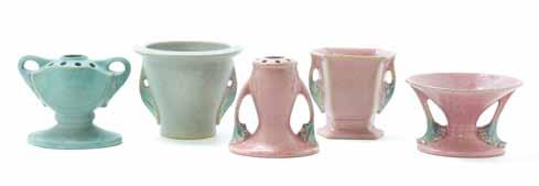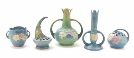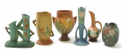 680* Four Roseville Pottery Vases, comprising a handled baluster example in the Magnolia pattern, numbered 93-9, a handled cylindrical example in the Prim Rose pattern, numbered 763-7, a low circular example in the Mock Orange pattern, numbered 926-6, and a handled bulbous example in the Bleeding Heart pattern, numbered 377-11, each with various marks. Height of tallest 9 1/4 inches. Property from the Estate of Ms. Jacqueline Kuznicki, Chicago, Illinois $150-250 681* Five Roseville Pottery Articles, comprising a double wall pocket and a vase in the Cosmos pattern, a wall pocket in the Columbine pattern, numbered 1290-8, a vase in the Poppy pattern, numbered 945-3, and a vase in the White Rose pattern, numbered 984-5, together with another Roseville example numbered 866-6, each with various marks. Height of tallest 8 1/4 inches. Property from the Estate of Ms. Jacqueline Kuznicki, Chicago, Illinois $400-600