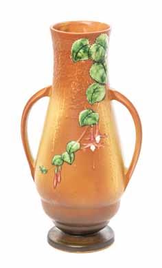 566* A Roseville Pottery Vase, in the Fuschia pattern, of handled baluster form, on a brown ground, numbered 905-18, marked Roseville. Height 18 1/2 inches. Property from the Estate of Ms. Jacqueline Kuznicki, Chicago, Illinois $300-500