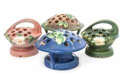 673* Four Roseville Pottery Flower Frogs, each of various patterns, three numbered 22, 26, 41, each with various marks. Height of tallest 7 1/2 inches. Property from the Estate of Ms. Jacqueline Kuznicki, Chicago, Illinois $100-200 674* Four Roseville Pottery Vases, one in the Thorn Apple pattern, numbered 815-7, one in the Velmoss pattern, and two in the Teasel pattern, numbered 644-4 and 885-8, two with various marks. Height of tallest 8 3/8 inches. Property from the Estate of Ms. Jacqueline Kuznicki, Chicago, Illinois $300-500