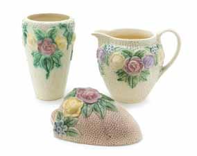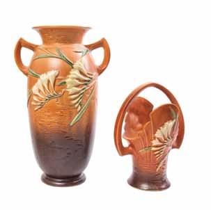 557* Three Roseville Pottery Articles, each in the Freesia pattern, comprising a vase and two shell form jardinières, together with a ewer in the Fuschia pattern, numbered 6-15, 117, 1126-6, 1126-6, each marked Roseville USA. Height of tallest 15 1/2 inches. Property from the Estate of Ms. Jacqueline Kuznicki, Chicago, Illinois $150-250 558* Two Roseville Pottery Articles, each in the Freesia pattern, comprising a vase of handled baluster form, numbered 128-15 and a basket numbered 392-10, each marked Roseville USA. Height of first 15 5/8 inches. Property from the Estate of Ms. Jacqueline Kuznicki, Chicago, Illinois $200-400