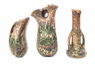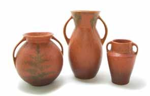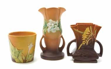611* Eight Roseville Pottery Vases, each in the Pine Cone pattern, of handled form with a brown ground, six numbered 121-7, 283-8, 353-11, 49110, 632-3, 748-6, one with original foil label. Height of tallest 10 1/2 inches. Property from the Estate of Ms. Jacqueline Kuznicki, Chicago, Illinois $500-700 612* Three Roseville Pottery Vases, each in the Pine Cone pattern, one of three-mouth form, one of shell form and one of flattened form, two numbered, 272 and 427. Height of tallest 8 5/8 inches. Property from the Estate of Ms. Jacqueline Kuznicki, Chicago, Illinois $100-200