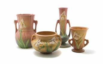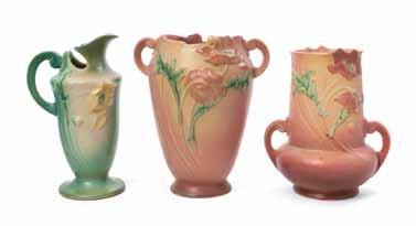 580* Three Roseville Pottery Articles, each in the Imperial pattern, comprising two wall pockets and a bud vase. Height of tallest 10 inches. Property from the Estate of Ms. Jacqueline Kuznicki, Chicago, Illinois $200-400 581* Four Roseville Pottery Vases, each in the Iris pattern of handled form, two with a tan ground and two with a pink ground, numbered 647-3, 914-4, 917-6, 918-7. Height of taller 7 5/8 inches. Property from the Estate of Ms. Jacqueline Kuznicki, Chicago, Illinois $100-200