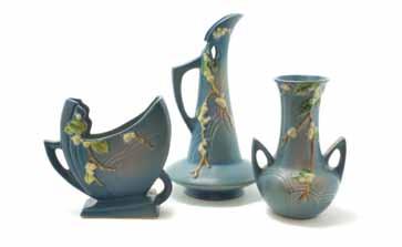 628* Three Roseville Pottery Articles, each in the Snowberry pattern with a blue ground, comprising a ewer marked Roseville USA ITK-1, a baluster vase marked Roseville USA IV2-7 and a flattened vase marked Roseville USA IFH-6. Height of tallest 10 3/4 inches. Property from the Estate of Ms. Jacqueline Kuznicki, Chicago, Illinois $150-250