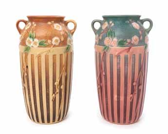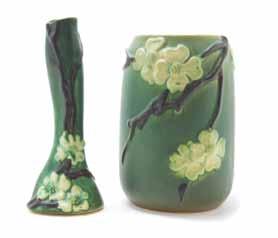 528* Four Roseville Pottery Vases, each in the Cherry Blossom pattern, of handled baluster form, three having an orange ground, one with a green ground, one with original foil label to base. Height of tallest 7 1/8 inches. Property from the Estate of Ms. Jacqueline Kuznicki, Chicago, Illinois $400-600 529* Three Roseville Pottery Vases, each in the Cherry Blossom pattern, of handled baluster form, two having an orange ground, one with a pink ground, one with original foil label to base. Height of tallest 7 1/8 inches. Property from the Estate of Ms. Jacqueline Kuznicki, Chicago, Illinois $300-500