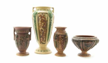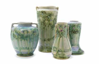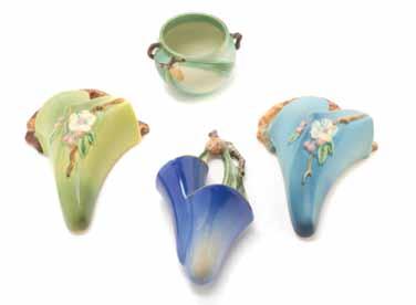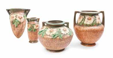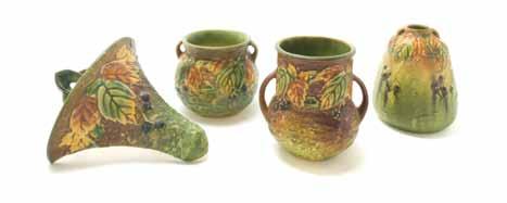 518* Four Roseville Pottery Articles, each in the Bittersweet pattern, comprising a double bud vase, a flared vase, a jardinière and a rectangular planter, numbered 800-4, 858, 868-8, 874-7, each marked Roseville USA. Height of tallest 7 3/8 inches. Property from the Estate of Ms. Jacqueline Kuznicki, Chicago, Illinois $100-200 519* Four Roseville Pottery Articles, each in the Blackberry pattern, comprising three vases and one wall pocket. Height of tallest 8 1/4 inches. Property from the Estate of Ms. Jacqueline Kuznicki, Chicago, Illinois $400-600