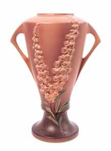 553* A Roseville Pottery Vase, in the Foxglove pattern, of tapering handled cylindrical form with a pink ground, numbered 55-16, marked Roseville USA. Height 16 1/2 inches. Property from the Estate of Ms. Jacqueline Kuznicki, Chicago, Illinois $300-500