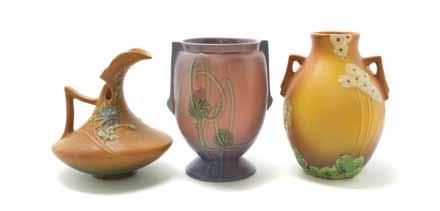 623* Three Roseville Pottery Articles, each in the Rozane pattern, comprising a basket, a vase and a jardinière. Height of tallest 12 inches. Property from the Estate of Ms. Jacqueline Kuznicki, Chicago, Illinois $80-120 624* Three Roseville Rozane Ware Pottery Articles, comprising a jug, a paperweight and a handled vase, each decorated with flowers, with various marks to base. Height of tallest 6 3/4 inches. Property from the Estate of Ms. Jacqueline Kuznicki, Chicago, Illinois $100-200