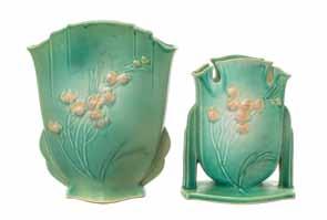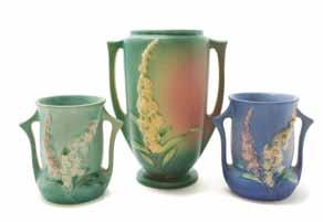 554* Three Roseville Pottery Vases, each in the Foxglove pattern and of double handled form, two with a green glaze and the third with a blue glaze, two numbered 42-4, 45-7, marked Roseville USA. Height of tallest 7 3/8 inches. Property from the Estate of Ms. Jacqueline Kuznicki, Chicago, Illinois $200-400 555* Two Roseville Pottery Articles, each in the Freesia pattern, comprising a jardinière numbered 469-14 and a center bowl numbered 6696. Width of wider over handles 16 1/4 inches. Property from the Estate of Ms. Jacqueline Kuznicki, Chicago, Illinois $150-250