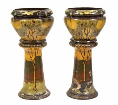 508 A Pair of Roseville Decorated Landscape Jardinières and Pedestals, Frederick Rhead, circa 1905, each having stylized landscape decoration on a mustard yellow ground, one jardinière initialled H.S., the other with conjoined HR initials. Height 32 1/2 inches.