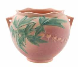 520* A Roseville Pottery Jardinière, in the Bleeding Heart pattern, of handled form with a pink ground, numbered 651-6, marked Roseville USA. Width over handle 10 1/4 inches. Property from the Collection of Dr. David G. Ostrow, Chicago, Illinois