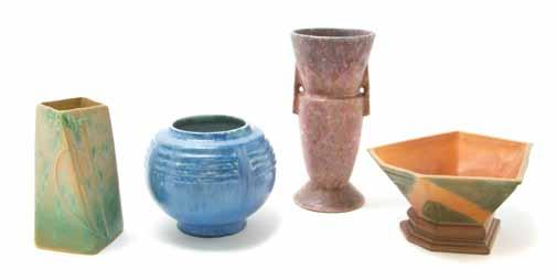 568* Four Roseville Pottery Articles, each in the Futura pattern, with various glazes, the first of faceted footed form, the second of twisted square form, a handled baluster example and a spherical example, the first with original paper label. Height of tallest 9 1/4 inches. Property from the Estate of Ms. Jacqueline Kuznicki, Chicago, Illinois $800-1,200