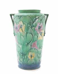 588* Three Roseville Pottery Vases, each in the Laurel pattern, of various forms and sizes, comprising one on a yellow ground, one on a green ground and one on an orange ground, bearing original foil label. Height of tallest 6 1/4 inches. Property from the Estate of Ms. Jacqueline Kuznicki, Chicago, Illinois $200-400 589* A Roseville Pottery Vase, in the Laurel pattern, of tapering cylindrical form raised on a stepped circular foot, on a brown and green ground. Height 14 1/4 inches. Property from the Estate of Ms. Jacqueline Kuznicki, Chicago, Illinois $300-500