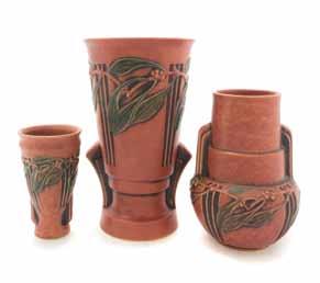 578* Four Roseville Pottery Articles, comprising a Futura vase and wall pocket and two Monticello vases. Height of tallest 8 1/4 inches. Property from the Estate of Ms. Jacqueline Kuznicki, Chicago, Illinois $500-700 579* Eight Roseville Pottery Articles, each in the Imperial pattern, comprising three vases of double handled form, three of basket form, a tree trunk form vase and a jardinière. Height of tallest 9 1/2 inches. Property from the Estate of Ms. Jacqueline Kuznicki, Chicago, Illinois $300-500