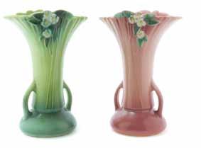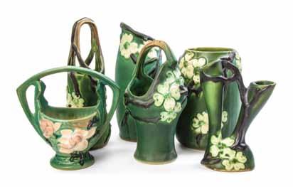 509* Two Roseville Pottery Articles, each in the Antique Matt Green pattern, comprising a ewer and a vase. Height of taller 11 inches. Property from the Estate of Ms. Jacqueline Kuznicki, Chicago, Illinois $200-400 510* Five Roseville Pottery Articles, each in the Apple Blossom pattern, comprising four handled baluster form vases and a basket, numbered 309-8, 381-6, 388-10, 389-10, 389-10, each marked Roseville USA. Height of tallest 10 1/4 inches. Property from the Estate of Ms. Jacqueline Kuznicki, Chicago, Illinois $200-400