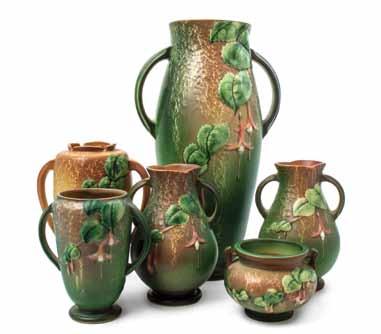 564* Six Roseville Pottery Vases, in the Fuschia pattern, each of handled form on a green ground, one with a brown ground, two numbered 895-7, one numbered 897-8 and one numbered 904-15, five marked Roseville. Height of tallest 15 1/2 inches. Property from the Estate of Ms. Jacqueline Kuznicki, Chicago, Illinois $400-600