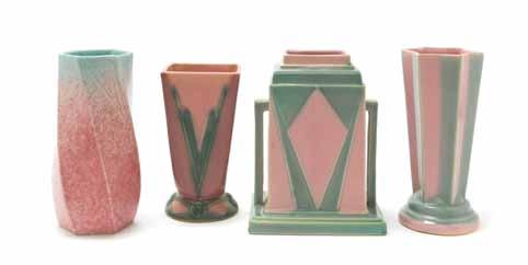 573* Four Roseville Pottery Vases, each in the Futura pattern with a pink and green glaze, the first of six pointed star form, the second of hexagonal twist form, the third of tapering square form and the fourth a rectangular example with geometric decoration. Height of first 8 1/4 inches. Property from the Estate of Ms. Jacqueline Kuznicki, Chicago, Illinois $300-500