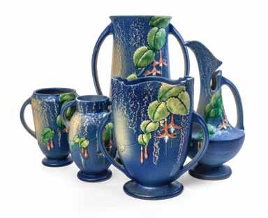 653* Five Roseville Pottery Vases, each in the Wisteria pattern, of handled form with a blue ground, one with the original foil label. Height of tallest 10 3/8 inches. Property from the Estate of Ms. Jacqueline Kuznicki, Chicago, Illinois $800-1,200