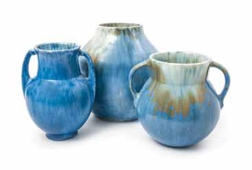 547* Two Roseville Pottery Vases, each in the Falline pattern, of handled form on a green to blue ground. Height of taller 9 1/4 inches. Property from the Estate of Ms. Jacqueline Kuznicki, Chicago, Illinois $500-700 548* A Roseville Pottery Vase, in the Falline pattern, of ovoid handled form. Height 15 inches. Property from the Estate of Ms. Jacqueline Kuznicki, Chicago, Illinois $1,000-2,000
